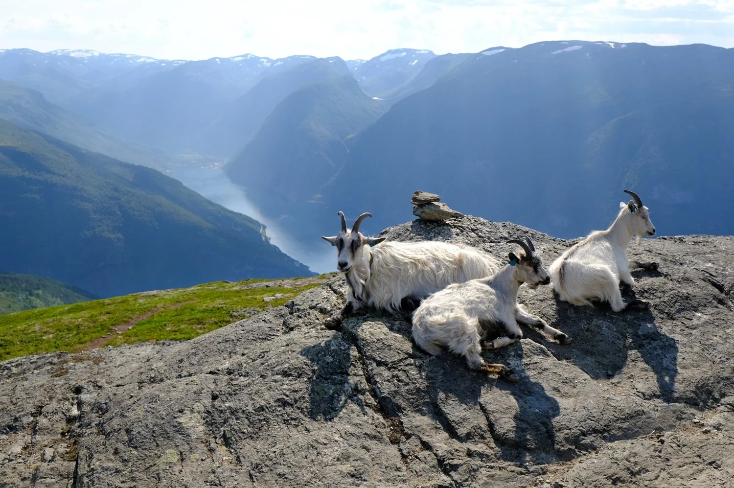 Geiter nyter fjellets ro. Her med utsikt fra Prest og ned til Aurlandsfjorden. Helt innerst i fjorden skimtes Flåm. Ekte geitost produseres av geitmelk, mens Gudbrandsdalsostene inneholder både ku- og geitemelk. Fløtemysostene bare kumelk.